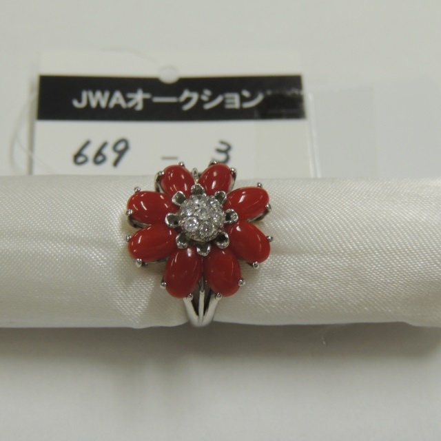 リング サンゴ ダイヤ Pt900 6.70g 石目:CO3.50 D0.14