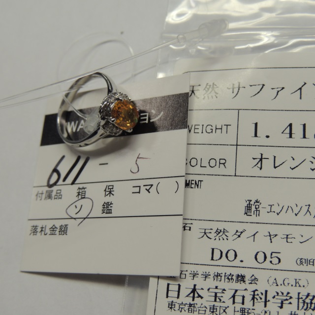 リング オレンジサファイア ダイヤ Pt900 4.20g ソ 石目:1.41 0.05