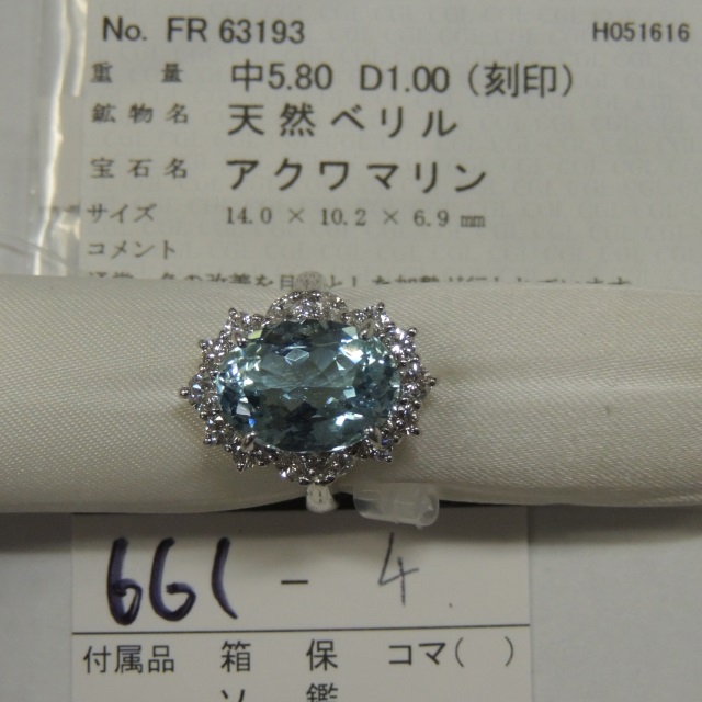 リング アクアマリン Pt900 12.00g 中ソ 石目:AQ5.80 FD1.00