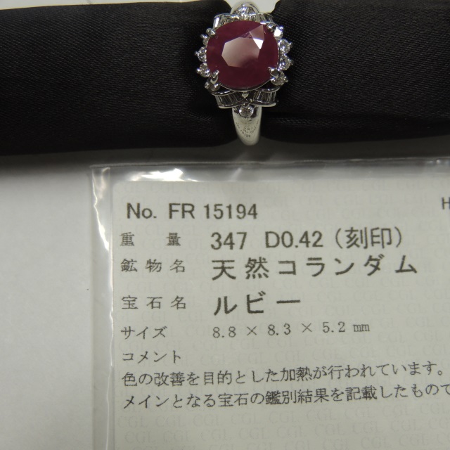 リング ルビー Pt900 6.40g 中ソ 石目:R3.47 FD0.42