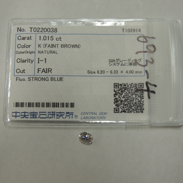 ルース ダイヤ K(FAINT BROWN)-I1-F-SB 中ソ 石目:1.015