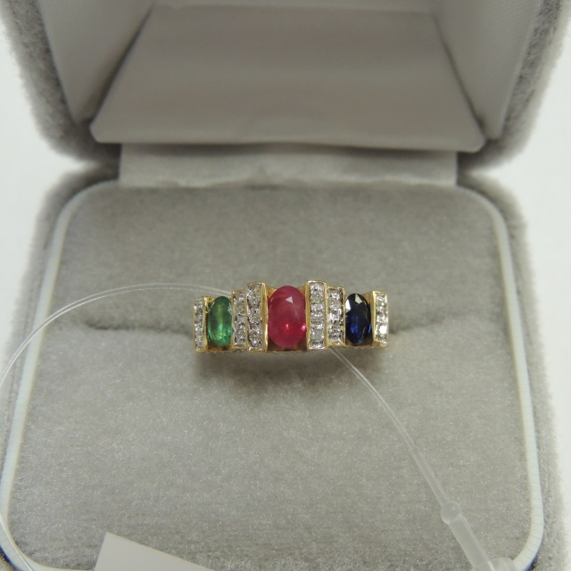 リング ルビー エメラルド サファイア ダイヤ K18 4.80g 石目:R0.56 E0.25 S0.21 FD0.09