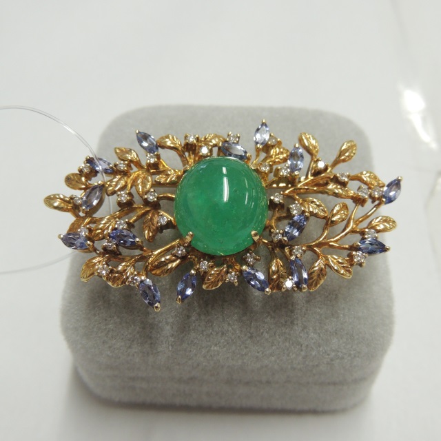 ブローチ エメラルド タンザナイト ダイヤ K18 18.10g 中宝鑑 石目:E12.88 TZ1.90 D0.62