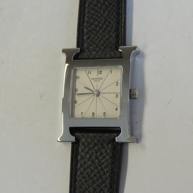 エルメス Hウォッチ HH1.210 アイボリー QZ □L刻 SS/革黒 箱 保