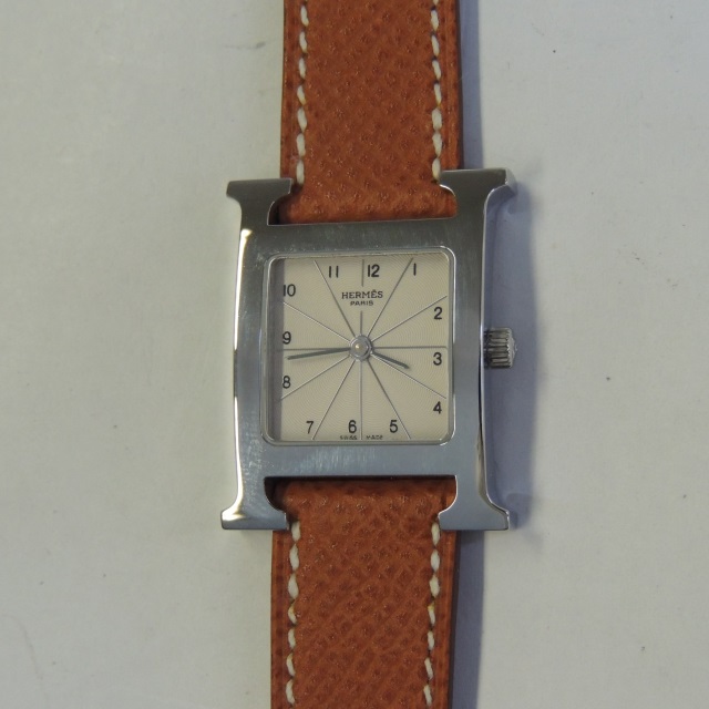 エルメス Hウォッチ HH1.210 アイボリー QZ □L刻 SS/革茶 箱 保